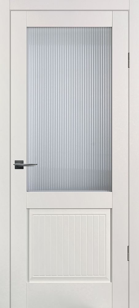 Полотно комплектуется объемной филенкой с фрезерованным рисунком "под рейку". В остекленных полотнах используется рифленное стекло с красивым прокатным узором в виде полос. Отлично смотрится в неоклассических и лофтовых интерьерах.